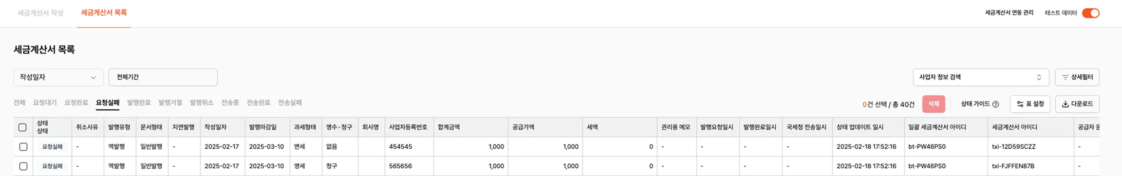 • 세금계산서 > 세금계산서 목록 > 요청실패
